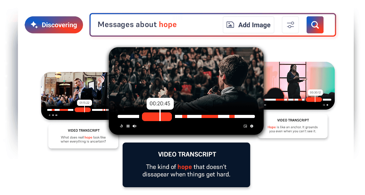 Search every word across your entire video library: messages, dialogue, and themes. Find the the exact moment you want.